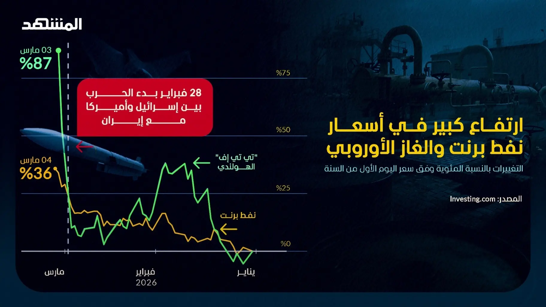 والثلاثاء، ارتفعت عقود النفط الآجلة من خام "برنت" لمدة وجيزة متجاوزة 85 دولاراً للبرميل، بينما وصلت أسعار الغاز الطبيعي في أوروبا إلى أعلى مستوى لها منذ عام 2023.