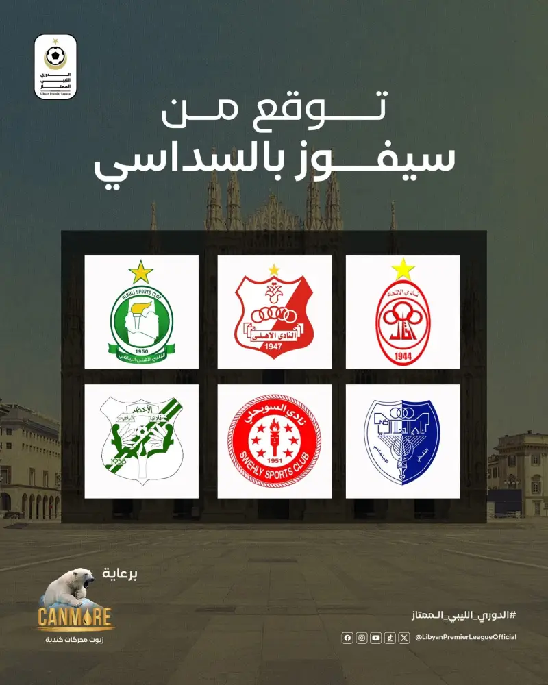 تتنافس 6 فرق بنظام الدوري "من دور واحد" بمدينة ميلانو الإيطالية على لقب بطل الدوري الليبي بموسمه الجاري وأيضا بطاقات التأهل للبطولات الإفريقية، وهم الأهلي بنغازي والهلال والسويحلي والأهلي طرابلس والاتحاد والأخضر.