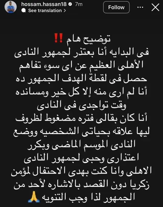 سارع حسان حسن، لاعب موردن سبورت، بالاعتذار لجماهير المارد الأحمر، بل وكشف سر احتفاليته، وذلك عبر نشره لبيان رسمي على صفحته بموقع "انستغرام".