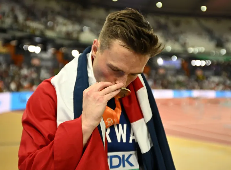 وحُرم المتسابق النرويجي المُتوج بذهبية أولمبياد طوكيو في نفس التخصص، من الفوز بذهبية بطولة العالم لألعاب القوى للعام الثاني على التوالي.