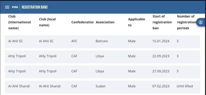 وتم إيقاف أيضًا نادي أهلي طرابلس الليبي، لـ3 فترات انتقال (صيفية وشتوية) بداية من 27 سبتمبر 2023، ولذلك فإنه لا وجود لاسم النادي الأهلي المصريّ في قائمة الممنوعين.