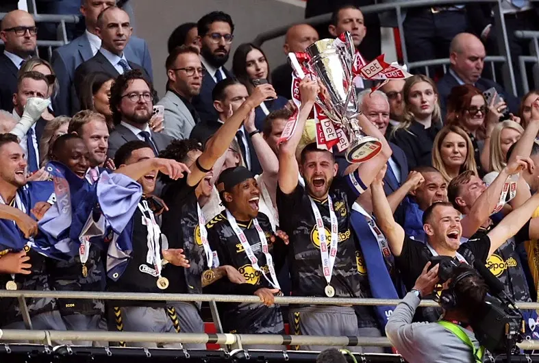 وعمّت فرحة عارمة في "ويمبلي" مع صافرة نهاية اللقاء التي أعلنت صعود فريق المدرب راسل مارتن إلى البريمرليغ.