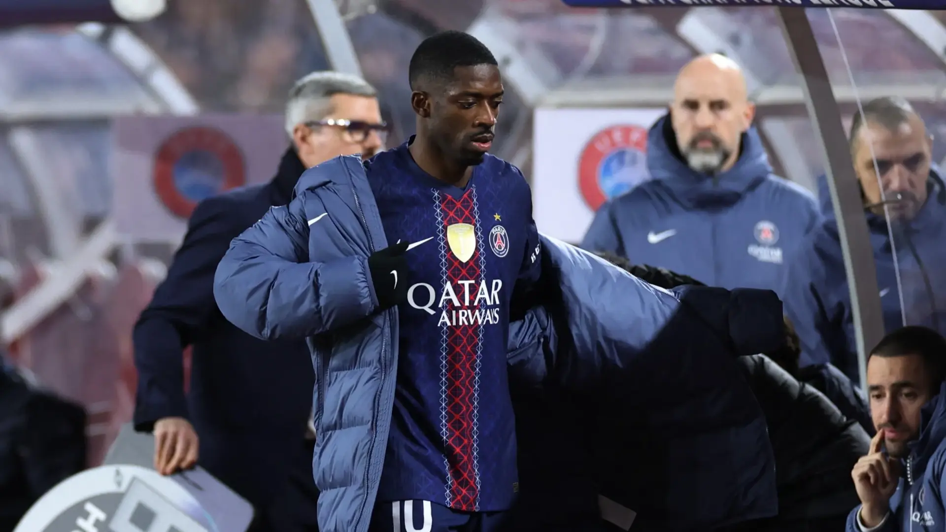 تعرض ديمبلي لإصابة في الساق، كانت مشاركته على إثرها محل شك قبل انطلاق المباراة، قبل أن تتفاقم خلال مجريات الشوط الأول، ما أجبر الجهاز الفني على استبداله في الدقيقة 27 تقريبا، بعد ظهوره وهو يعرج بوضوح أثناء خروجه من أرض الملعب.