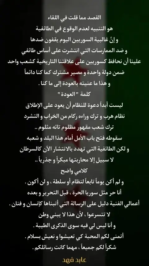 قال عابد فهد إن قصده من اللقاء، هو التنبيه لعدم الوقوع في الطائفية، مؤكدًا أن على السوريين الحفاظ على العلاقات التاريخية كشعب واحد داخل دولة واحدة.