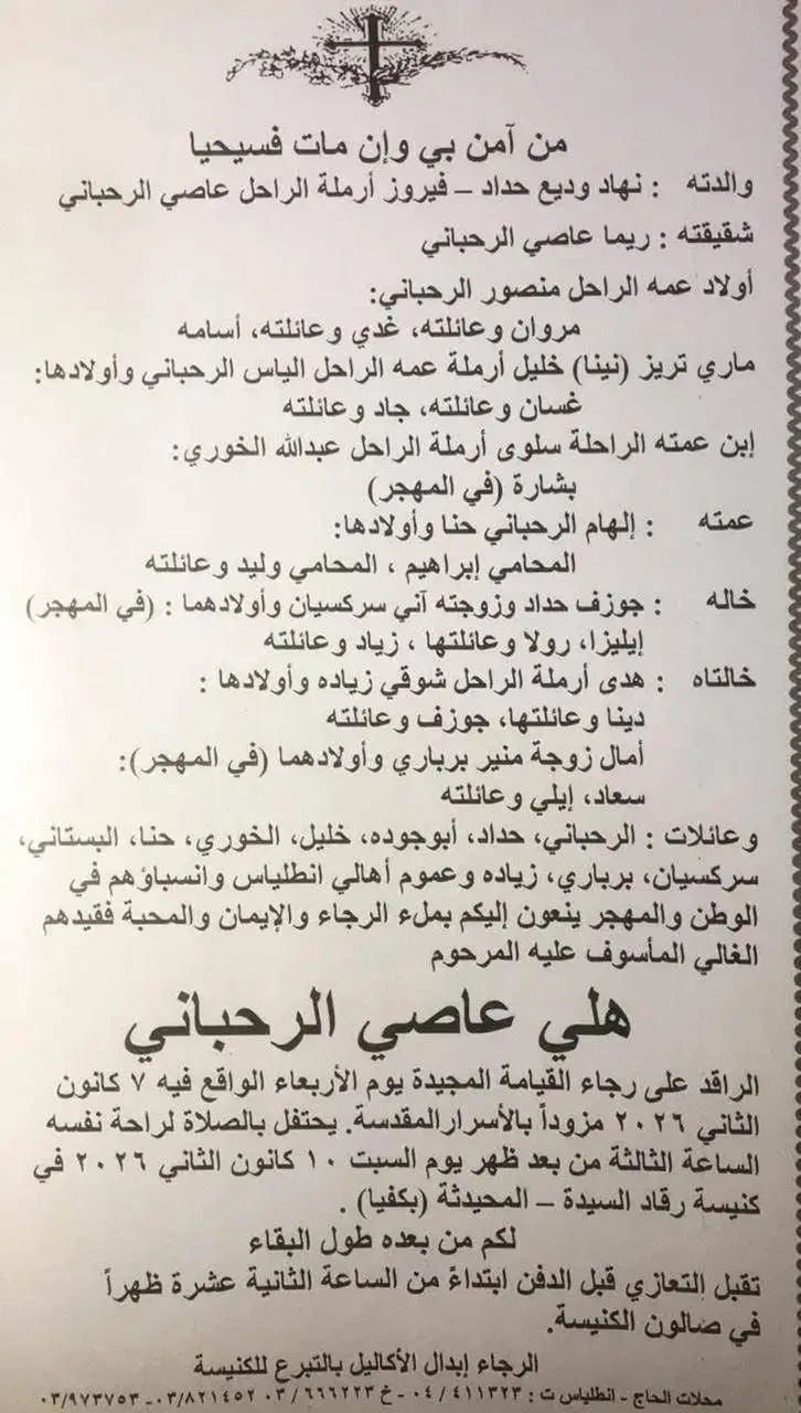 وفقًا لإعلان عائلة الرحباني، فمن المقرر أن تقام جنازة الراحل هلي الرحباني نجل الفنانة فيروز، غدًا السبت في تمام الساعة 3 مساءًا، بكنيسة رقاد السيدة بمنطقة المحيدثة- بكفيا، حيث سيوارى جثمانه الثري في مدافن العائلة.
