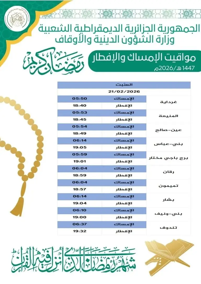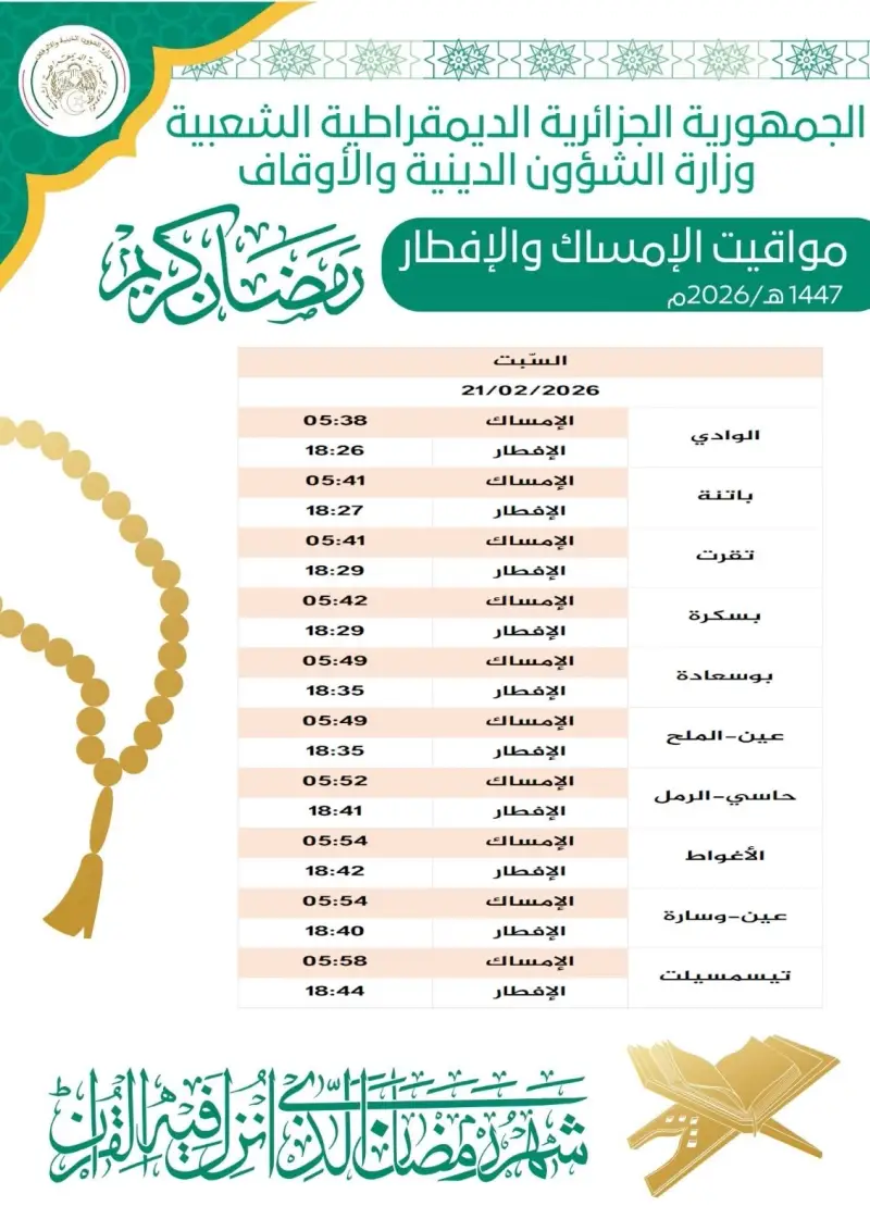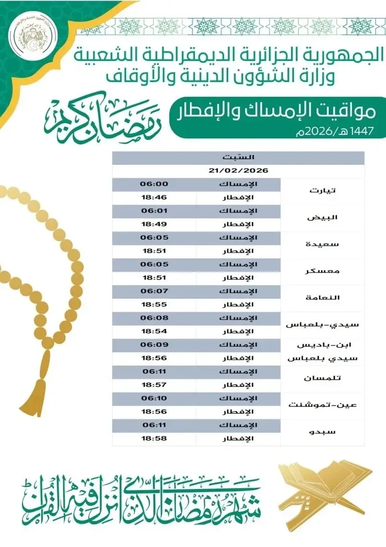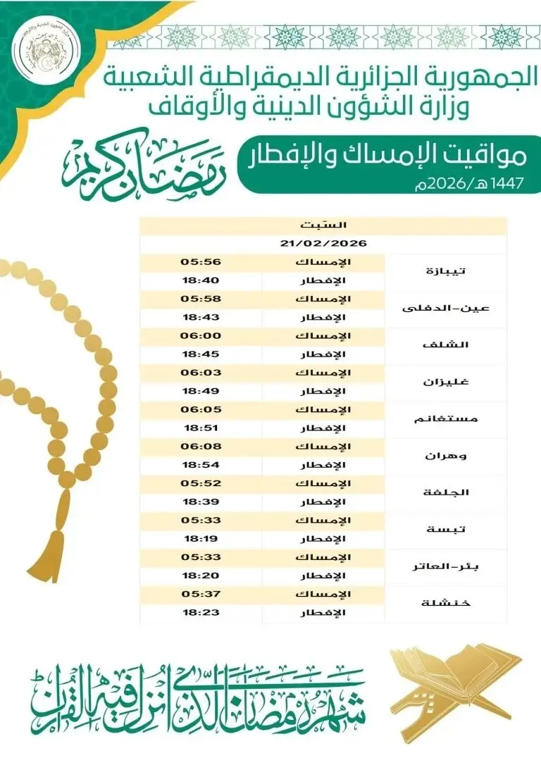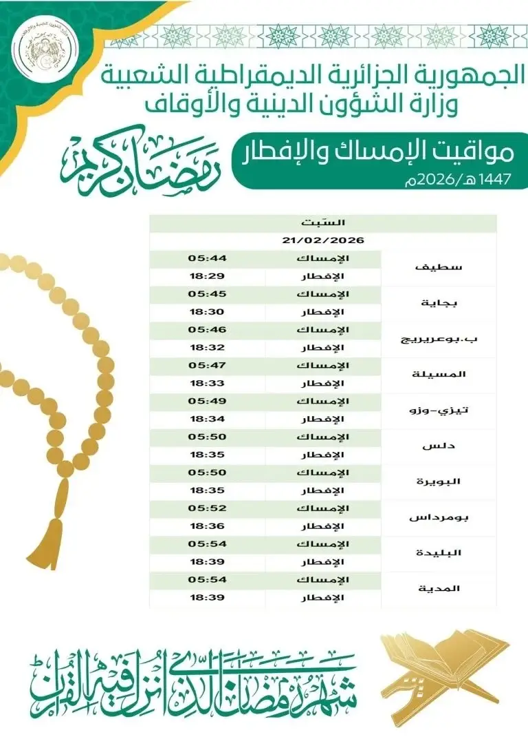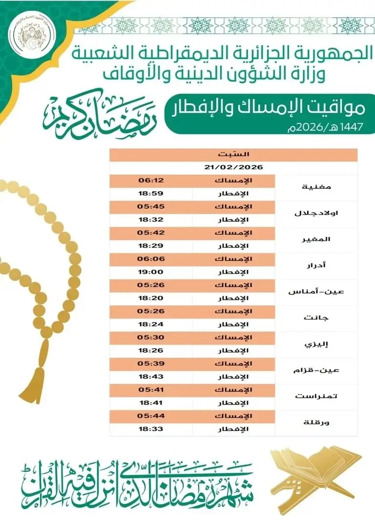 أعلنت وزارة الشؤون الدينية والأوقاف مواقيت الإمساك والإفطار لجميع الولايات في الجزائر رمضان 2026.