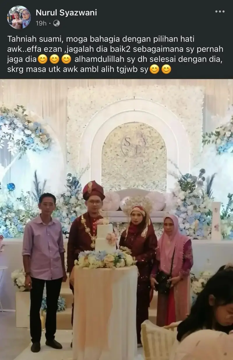 وكتبت الزوجة السابقة لزوجها قائلة: "مبروك يا زوجي.. قد تسعد مع من اختارها قلبك"، كما كتبت تهنئة لعروسه الجديدة إيفا عزان، وأوصتها عليه قائلة: "اعتني به جيدًا كما اعتنيت به أنا، الحمد لله، انتهت مهمتي معه، والآن حان الوقت كي تتولَي المسؤولية".