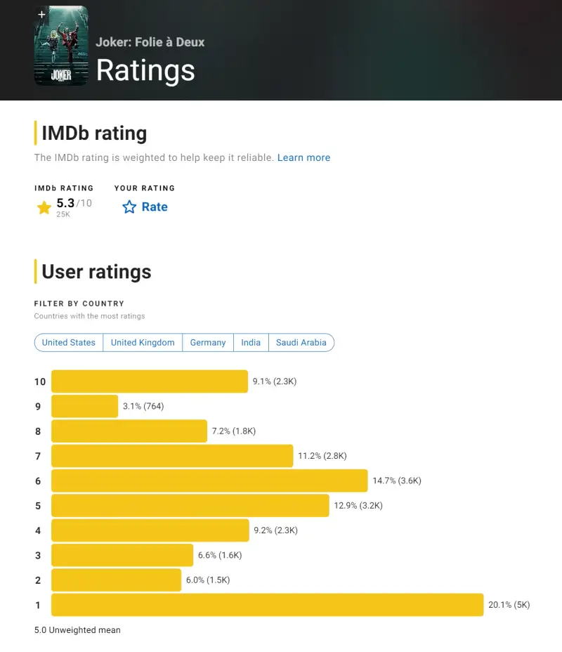 جاء تقييم فيلم الجوكر الجديد 2024 Joker مفاجئ للكثير، إذ حصل الفيلم منذ بداية عرضه على تقييم 5.3 فقط على موقع IMDb، فمن أصل 26 ألف تقييم، اختار 5 ألاف شخص؛ تقييم 1 من 10 للفيلم، بينما اختار الأخرين تقييمات لرقم 5 من 10، فيما وصل تقييم 10 من 10 للجوكر على ذات الموقع من خلال 3 ألاف شخص فقط.