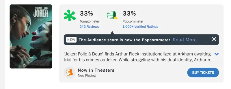 أما بالنسبة لموقع التقييمات الشهير أيضا Rotten Tomatoes، فقد حصل فيلم الجوكر الجديد على نسبة 33 % وهي نسبة منخفضة للغاية، وهذا ما يؤكد عدم نجاح الفيلم بشكل عالمي.