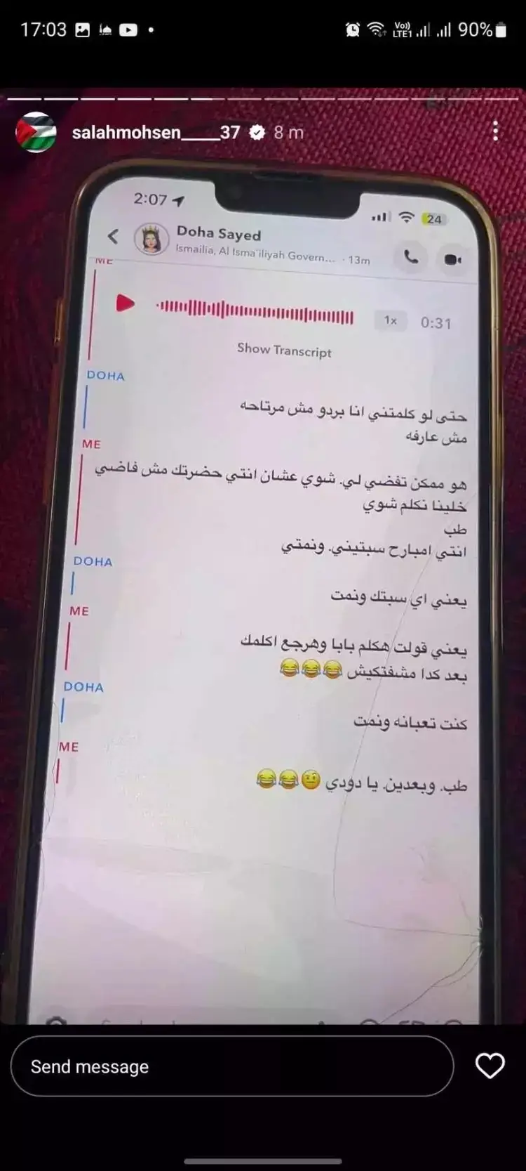 نشرت إسراء سامح زوجة لاعب الأهلي صور محادثات صلاح محسن مع عدد الفتيات، قالت إنها اكتشفت خيانة زوجها لها معهنّ عبر تطبيق "سناب شات".