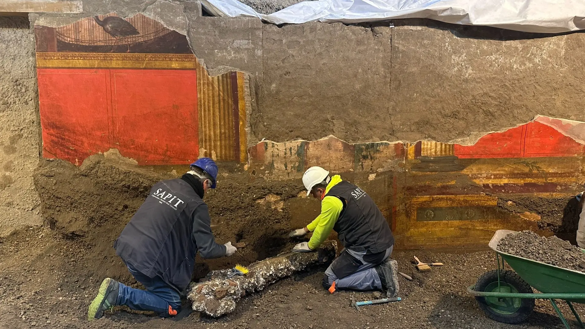 كشفت أعمال الترميم الجارية في فيلا بوبايا الرومانية قرب مدينة بومبي الإيطالية عن لوحات جدارية نادرة احتفظت بألوانها الزاهية رغم مرور نحو 2,000 عام على دفنها تحت رماد بركان فيزوف.