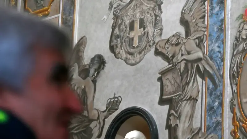 وإلى يمين تمثال نصفي من الرخام لأومبرتو الثاني، آخر ملوك إيطاليا، يظهر ملاك يحمل لفافة عليها خريطة إيطاليا، بملامح تُشبه إلى حد كبير ملامح رئيسة الحكومة الإيطالية المحافظة المتشددة.