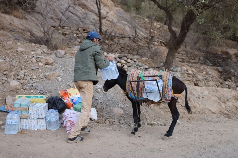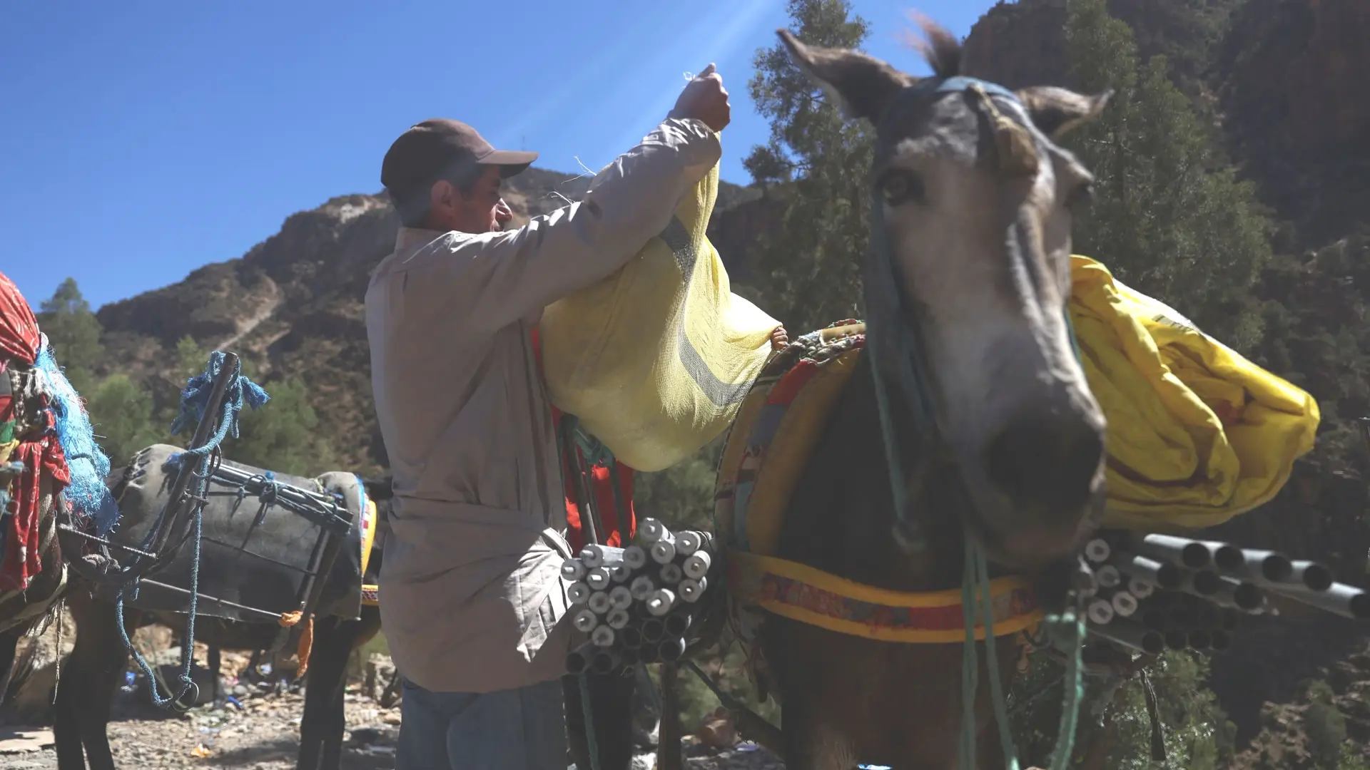 على جانب طريق مثلا، يقوم أحد سكان قرية أكنديز النائية في الأطلس الكبير بفرز حزم من إمدادات الإغاثة لقريته الواقعة على بعد 12 كيلومترا والتي لا يمكن الوصول إليها إلا عن طريق الحمير.