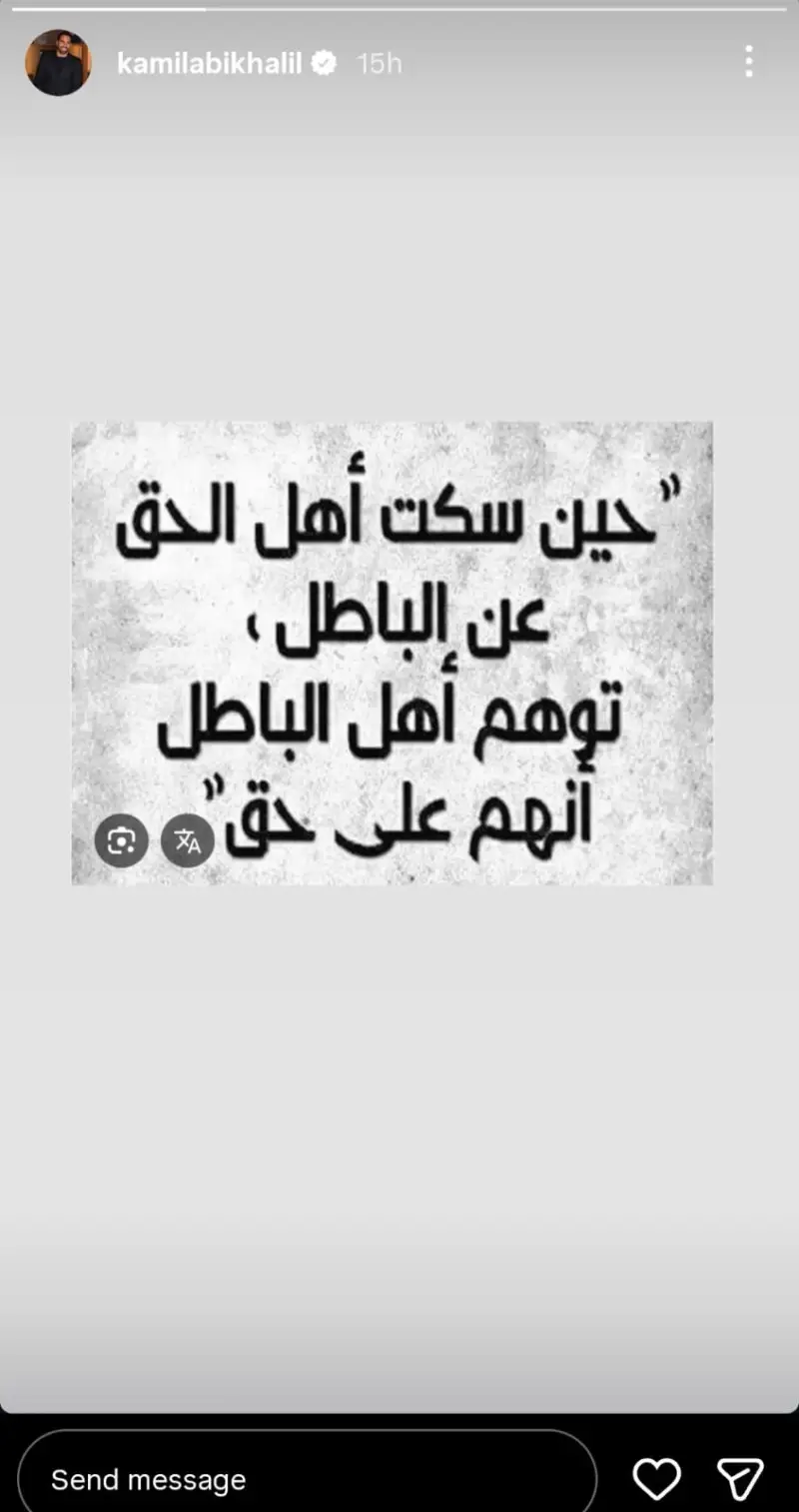 عبر حسابه الرسمي على منصة إنستغرام كتب كميل أبي خليل في خاصية الاستوري، حين سكت أهل الحق عن الباطل، توهم أهل الباطل أنهم على حق.