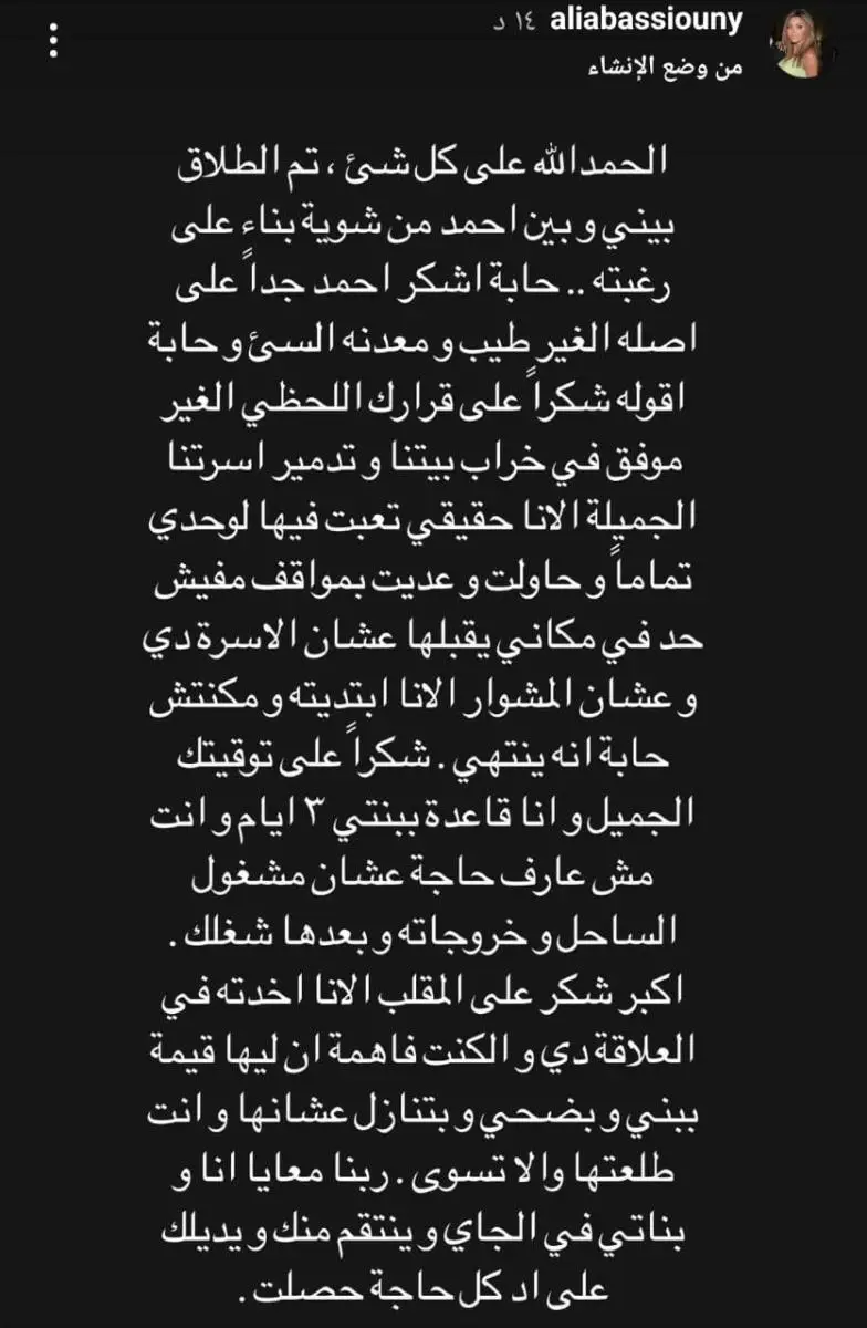وكتبت علياء الثلاثاء: "الحمد لله على كل شيء، تم الطلاق بيني وبين أحمد من شوية بناء على رغبته، وحابة أقوله شكرًا على قرارك اللحظي غير الموفق في خراب بيتنا وتدمير أسرتنا الجميلة اللي أنا حقيقي تعبت فيها لوحدي تمامًا وحاولت وعديت بمواقف مفيش حد في مكاني يقبلها عشان الأسرة دي وعشان المشوار اللي أنا ابتديته ومكنتش حابة انه ينتهي".