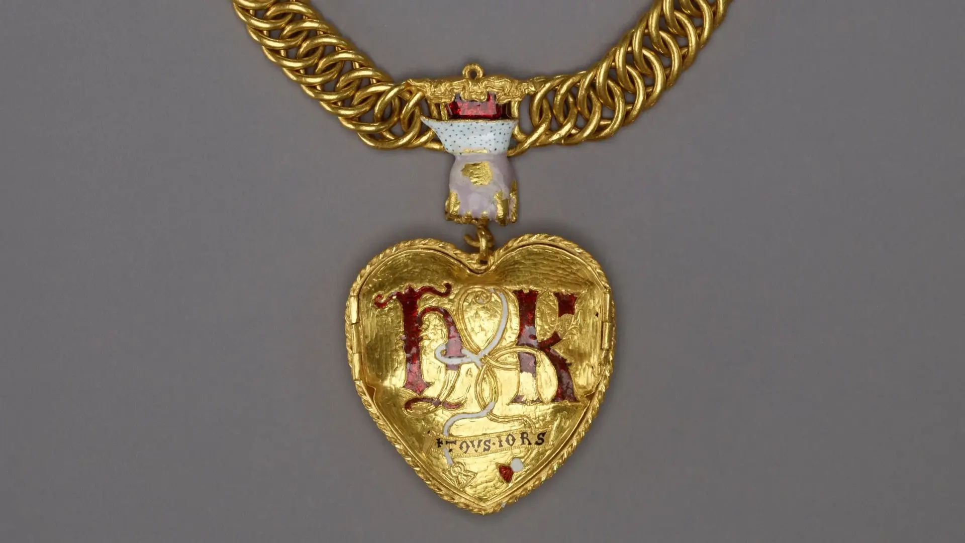 اشترى المتحف القلادة، المصنوعة من ذهب عيار 24 قيراطا وتحمل أول حرفين من اسمي الزوجين باللون الأحمر وصورة لوردة تيودور وشجرة رمان، بعد أن جمع 3.5 ملايين جنيه إسترليني (4.8 ملايين دولار) لإنقاذها من البيع إلى جامع تحف.