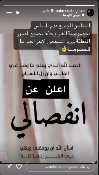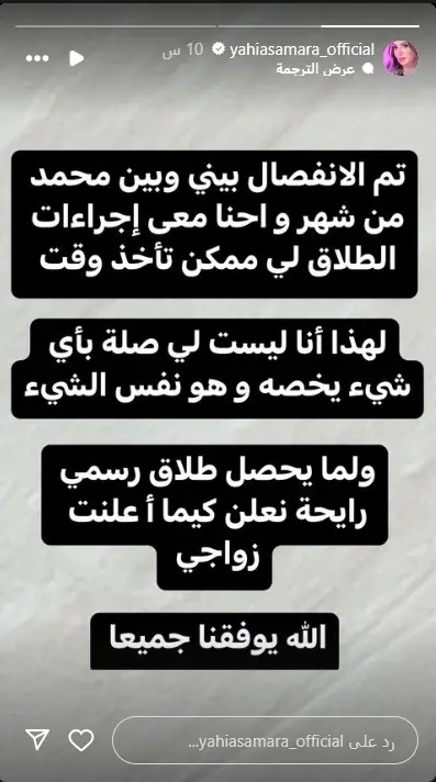 ومن جانبها، علقت أيضا الزوجة عبر خاصية القصص القصيرة "ستوري" بحسابها على موقع "إنستغرام"، قائلة: "تم الانفصال بيني وبين محمد من شهر، والإجراءات في طريقها للانتهاء لكنها تأخذ وقت، وحتى الآن لم يحدث طلاق رسمي لكن سوف نعلن كما أعلنت زواجنا".