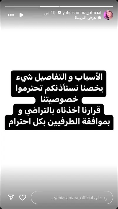 تابعت سمارة حديثها عن الانفصال قائلة: "الأسباب والتفاصيل شيء يخصنا ونستأذنكم احترموا خصوصيتنا والقرار كان بالتراضي وبموافقة الطرفين بكل احترام".