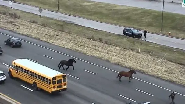 وظهر الحصانان وهما يركضان بين السيارات على طريق سريع في ولاية أوهايو الأميركية، ما شكل خطرا مروريا غير معتاد على السائقين الذي سارعوا لتخفيف سرعة مركباتهم وحتى التوقف عن السير ما إن رصدوا الحيوانين على الطريق.