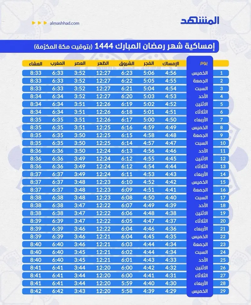 وفيما يلي تجدون الجدول الزمني لإمساكية شهر رمضان المبارك لعام 2023 (1444 هـ) ومواعيد الصلاة حسب توقيت مكة المكرّمة: