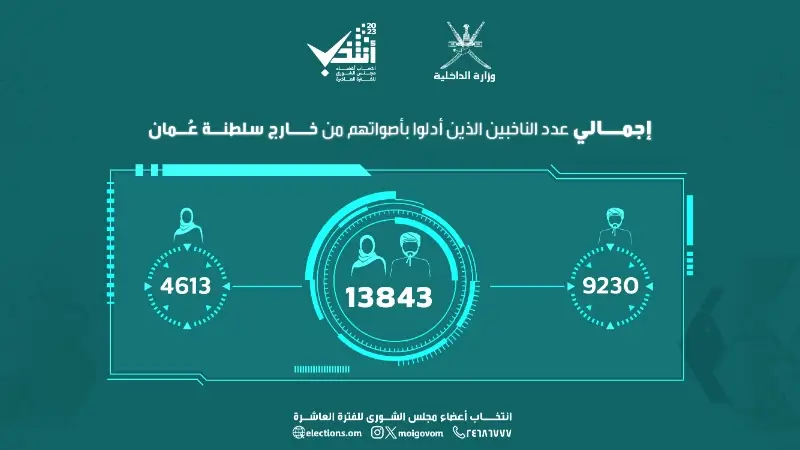 في التطورات، أعلنت لجنة انتخاب أعضاء مجلس الشورى انتهاء فترة تصويت الناخبين الموجودين خارج سلطنة عُمان، حيث أدلى 13843 ناخباً وناخبة بأصواتهم عبر تطبيق "أنتخب"، واختاروا من يمثلهم في عضوية مجلس الشورى للفترة العاشرة.