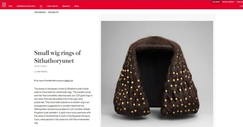 في الوصف الموجود على الصفحة الرسمية لمتحف المتروبوليتان الأميركي، أوضح أنه تم العثور على على 1251 حلقة ذهبية بحجمين مختلفين في الصناديق الخشبية، وأنه تم وضع تلك الحلقات بنفس الطريقة التي كانت تزين الشعر المستعار الذي تحلل، في الشعار المستعار الحديث.
