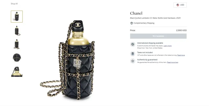 يظهر في مقدمة الحقيبة شعار ماركة كوكو شانيل CC باللون الذهبي كما تتدلى من بطانة الزجاجة سلسلة من الجلد الأسود الفاخر والمعدن الذهبي اللامع حتى يسهل حملها على الكتف بشكل أنيق.