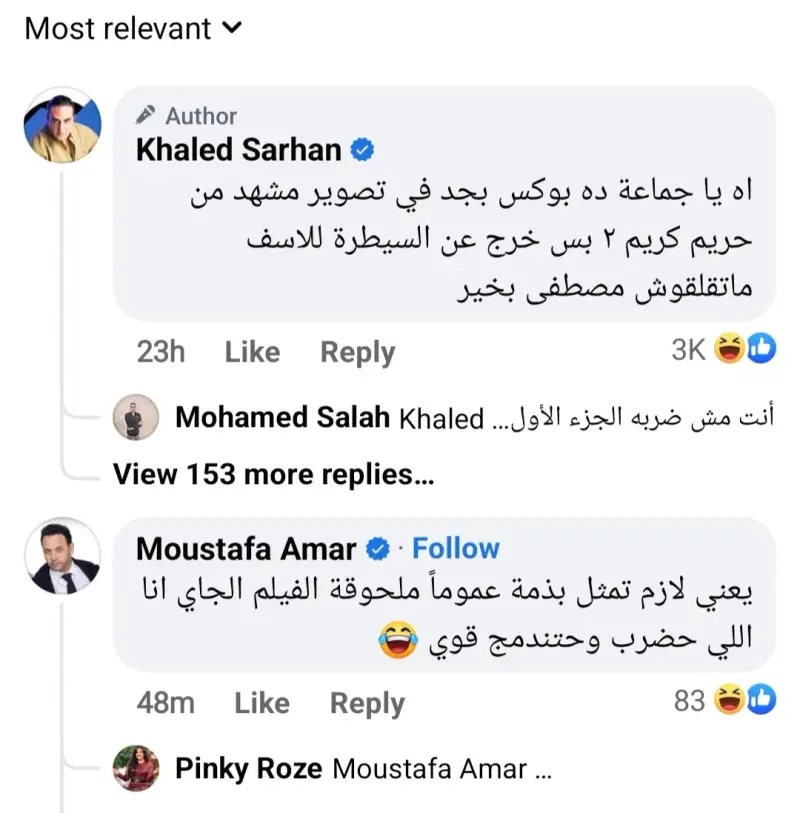 من جهته، ردّ مصطفى قمر على زميله في تعليق وقال: "يعني لازم تمثل بذمة عموماً ملحوقة الفيلم الجاي انا اللي حضرب وحتندمج قوي".