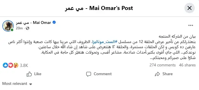 بعد وقت قصير على نشر مي عمر لسبب تأخر عرض الحلقة 12 من مسلسل الست موناليزا، حذفت المنشور من صفحتها الشخصية.