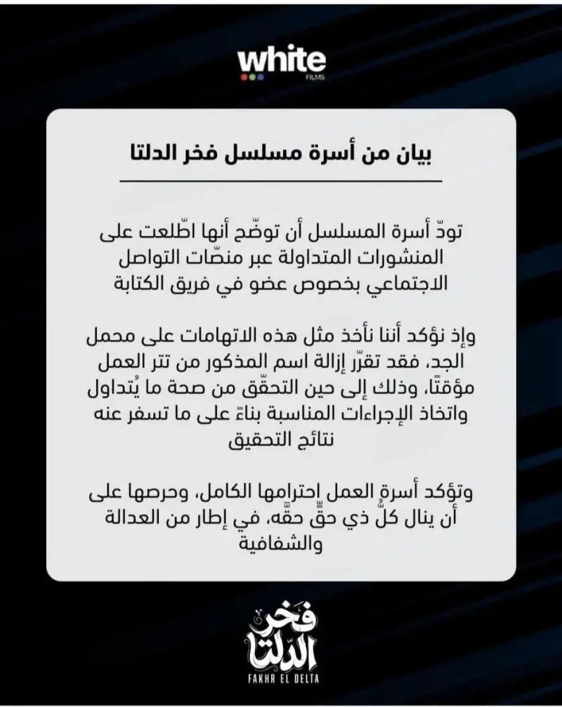 وأصدرت أسرة مسلسل فخر الدلتا بيانًا رسميًا للتعليق والرد على الاتهامات الموجهة لمؤلف العمل بالتحرش. وجاء البيان كالتالي: تود أسرة المسلسل أن توضّح أنها اطلعت على المنشورات المتداولة عبر منصات التواصل الاجتماعي بخصوص عضو في فريق الكتابة، وإذ نؤكد أننا نأخذ مثل هذه الاتهامات على محمل الجد، فقد تقرّر إزالة اسم المذكور من تتر العمل مؤقتا لحين التحقيق رسميًا في الواقعة".
