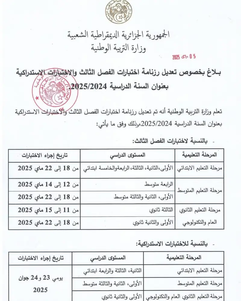 أعلنت وزارة التربية الوطنية بالجزائر عن تعديل روزنامة اختبارات الفصل الثالث، وأيضًا موعد الاختبارات الاستدراكية للعام الدراسي الجاري 2024-2025.