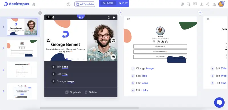 Decktopus هو برنامج قائم على السحابة يسمح بإنشاء عرض تقديمي مخصص لأغراض مختلفة. يحتوي الموقع على مكتبة من القوالب التي يمكن تحريرها بمختلف التخطيطات والألوان والصور، والنصوص والخطوط، وما إلى ذلك. ويساعد المحتوى المدعوم بالذكاء الاصطناعي في إنشاء العروض التقديمية بسهولة وسرعة. يسمح البرنامج بمشاركة العروض التقديمية عبر الإنترنت.