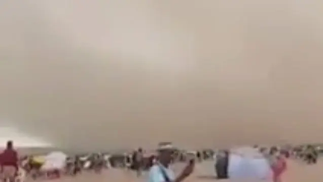 وقد سجل مقطع فيديو منتشر لحظة اجتياح العاصفة الرملية للمنطقة، مما أجبر المصطافين على ترك الشاطئ، والهروب بعيدا.