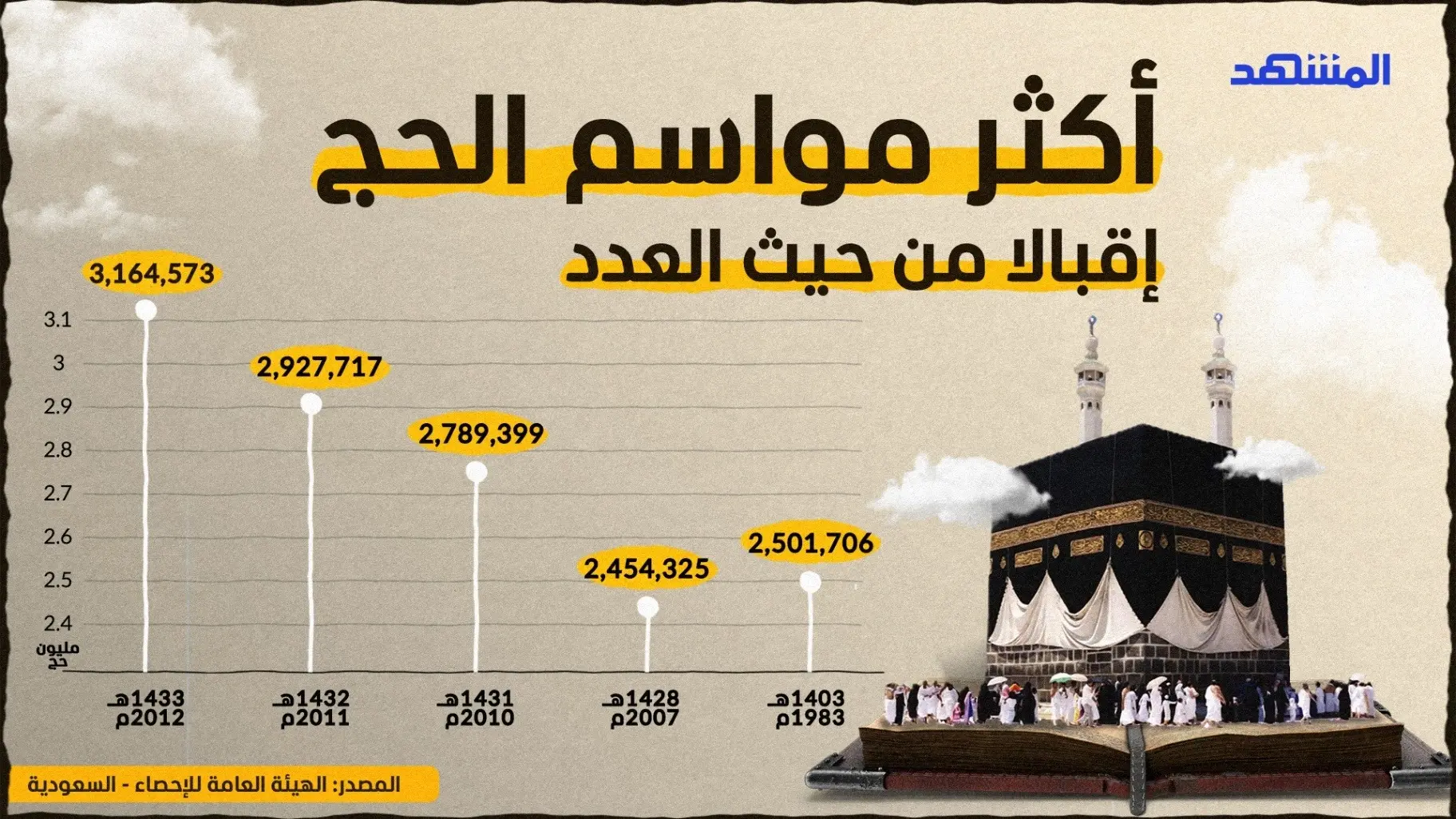 كان موسم الحج لعام 1433 هجرية 2012 ميلادية، أكثر مواسم الحج من حيث العدد خلال 50 عاما، بحسب ما تشير بيانات الهيئة العامة للإحصاء، حيث استقبلت المملكة نحو 3.161 مليون حاجًّا.