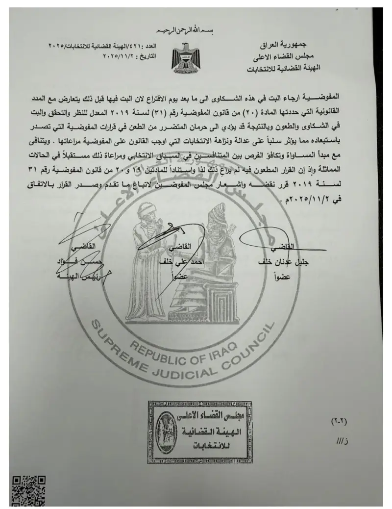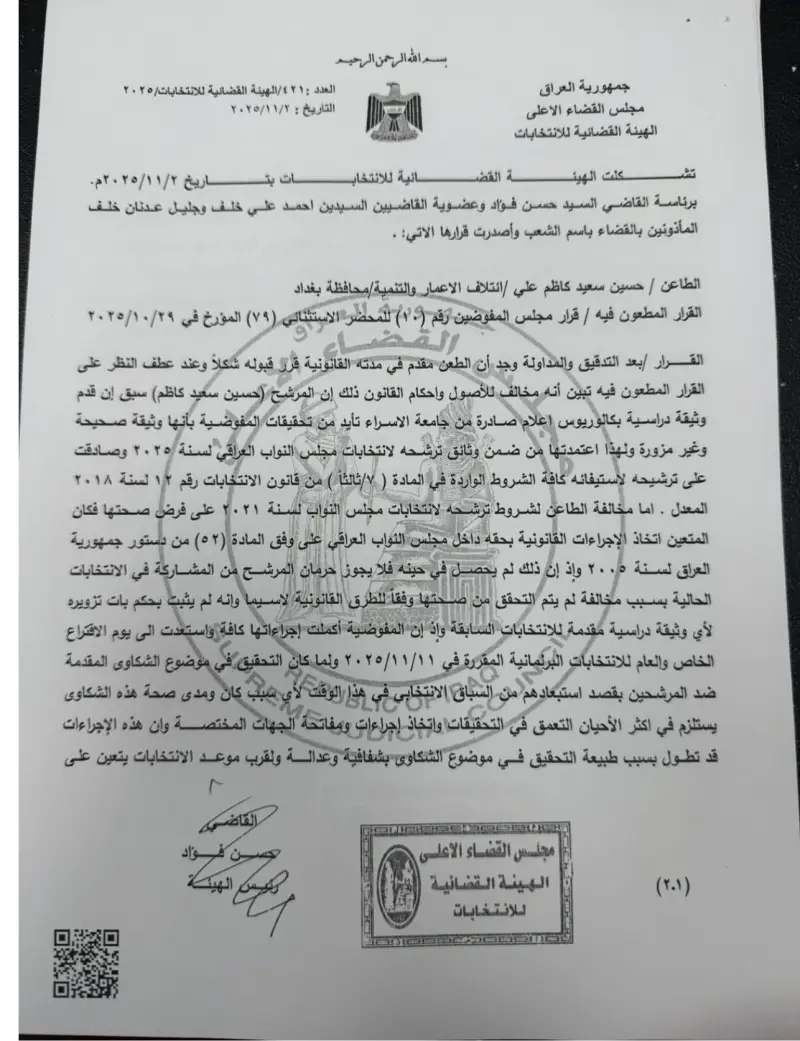 وفي أحدث التطورات بخصوص الأزمة، أعلن ائتلاف الإعمار والتنمية بقيادة السوداني البراءة من المرشح حسين عرب، وذلك بعدما تقدم بطلب للمفوضية العليا للانتخابات باستبعاد السوداني.