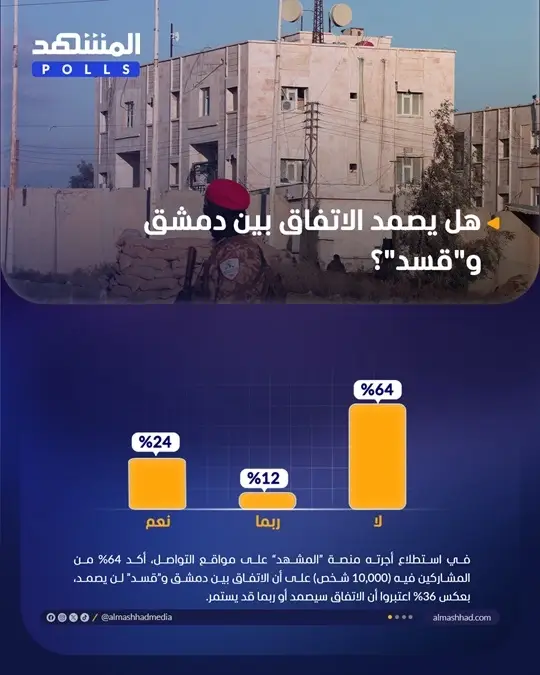 أمام الغموض الذي يلفّ الاتفاق الذي أُعلن عنه بين رئيس المرحلة الانتقالية في سوريا أحمد الشرع وقائد قوات "قسد" مظلوم عبدي، بشأن الاندماج في الجيش السوري، أجرت منصة "المشهد" استطلاعًا على صفحاتها في مواقع التواصل، تحت عنوان: "هل يصمد الاتفاق بين دمشق و"قسد"؟. وبحسب استطلاع "المشهد"، أكد 64% من المشاركين فيه (10,000 شخص) أنّ الاتفاق بين دمشق و”قسد” لن يصمد، بعكس 36% اعتبروا أنّ الاتفاق سيصمد أو ربما قد يستمر.