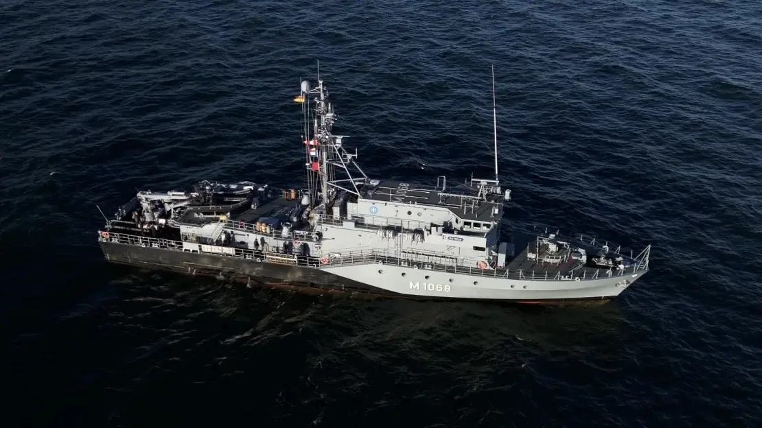 في البحر، قبالة سواحله، يقف طاقم كاسحة الألغام الألمانية FGS Datteln في الطرف الحاد من بحر البلطيق.
