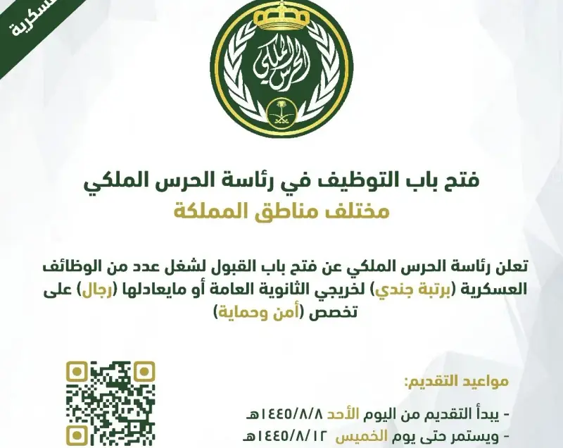 كشفت رئاسة الحرس الملكي، عن طريقة التقديم على وظيفة "جندي" بتخصص "أمن وحماية"، وذلك عن طريق الخطوات التالية: