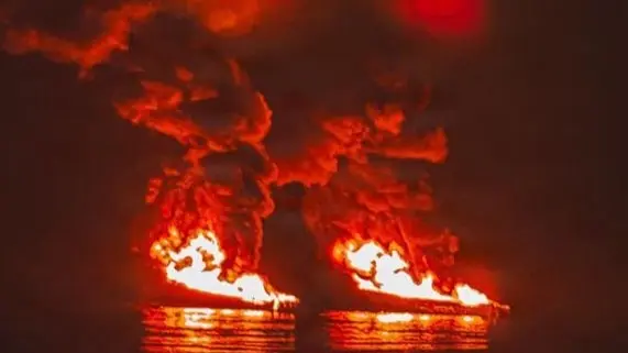 ويظهر مقطع فيديو مرتبط بالمنشور قاربا يتحرك عبر الماء قبل أن ينفجر وتشتعل فيه النيران.