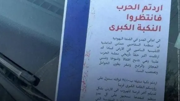 انتشرت على وسائل التواصل الاجتماعي صور لمنشورات تهدد سكان الضفة الغربية من الفلسطينيين بـ"نكبة جديدة".