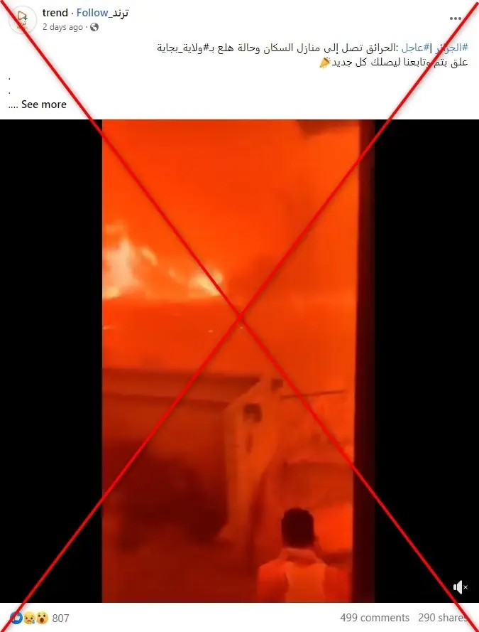 ويظهر الفيديو المنشور ألسنة نارٍ هائلة تقترب من منطقة سكنيّة، ويمكن مشاهدة أحد السكّان وهو يحاول الفرار. فيما جاء في التعليق المرافق "عاجل: الحرائق تصل إلى منازل السكان وحالة هلع بولاية بجاية".