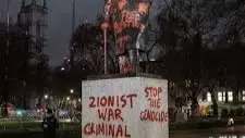 تعرض تمثال رئيس الوزراء البريطاني الأسبق ونستون تشرشل في ساحة البرلمان وسط لندن لعملية تخريب من خلال تدوين عبارات بالطلاء الأحمر تبدو مناهضة لإسرائيل، منها "الحرية لفلسطين" و"أوقفوا الإبادة الجماعية"، بحسب "تايمز أوف إسرائيل".