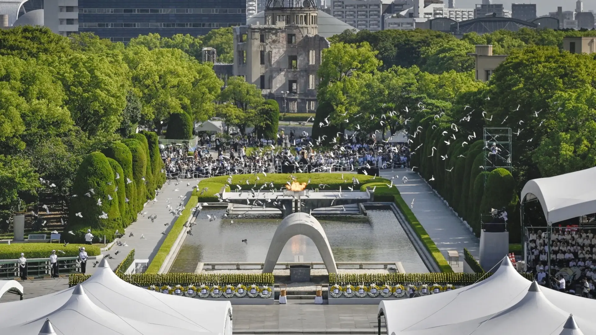 وقال رئيس بلدية المدينة، كازومي ماتسوي، الأربعاء إنّ "الولايات المتّحدة وروسيا تمتلكان 90% من الرؤوس الحربية النووية في العالم، وفي سياق الحرب الروسية في أوكرانيا والوضع المتوتر في الشرق الأوسط، نلاحظ اتجاها متسارعا لتعزيز القوة العسكرية في سائر أنحاء العالم".