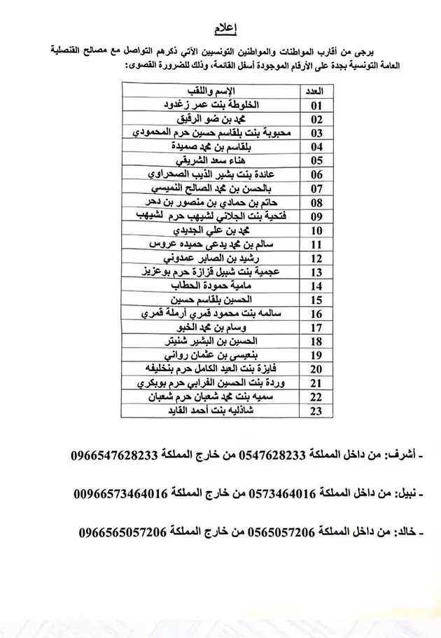 وفي وقت سابق، نشرت القنصلية التونسية على صفحتها الرسمية في منصة "فيسبوك" قائمة تضم اسماء الحج الـ23 من دون أن تكشف عن تفاصيل إضافية عن وضعهم داعية أقارب المذكورة أسماؤهم التواصل مع مكاتب القنصلية على أرقام هواتف وضعت على ذمتهم.