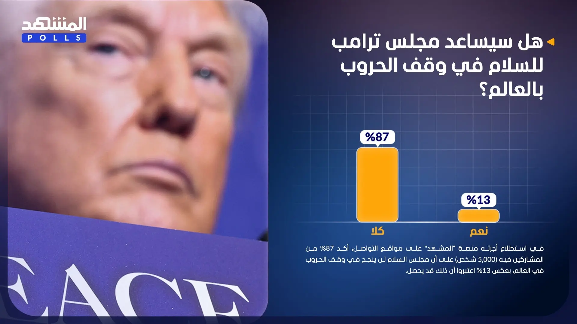 في استطلاع أجرته منصة "المشهد" على مواقع التواصل، أكد 87% من المشاركين فيه (5,000 شخص) على أن مجلس السلام لن ينجح في وقف الحروب في العالم، بعكس 13% اعتبروا أن ذلك قد يحصل.