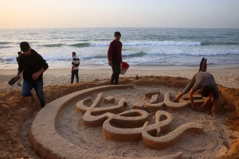 وعشية بدء شهر الصوم، رسم الفنان الفلسطيني زياد أبو جراد عبارة "أهلا رمضان" بخط مزخرف على رمال الشاطئ في دير البلح (وسط)، تحت أنظار أطفال المخيم المجاوز المكتظ بالنازحين.