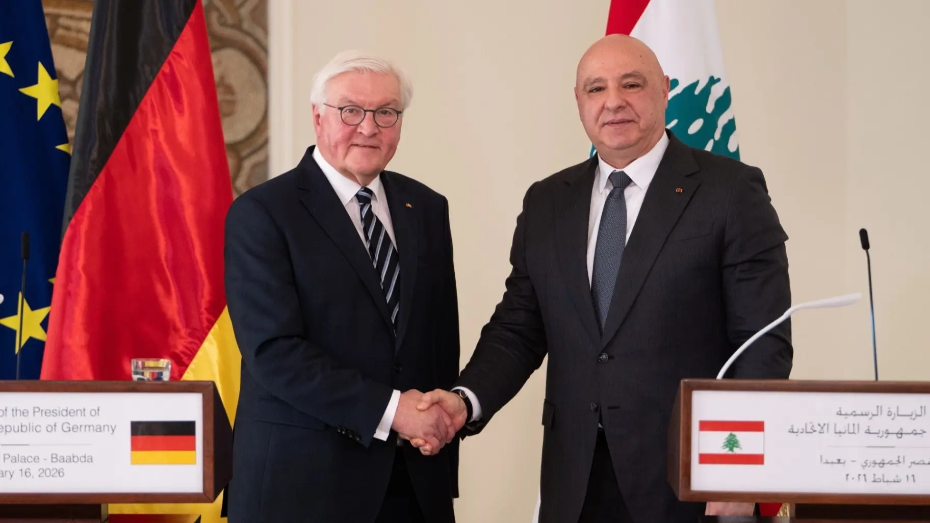 وأضاف شتاينماير خلال مؤتمر صحفي مشترك مع الرئيس اللبناني جوزيف عون في بيروت أن المطلب الآن هو أن يفي الطرفان بالتزاماتهما بموجب اتفاق وقف إطلاق النار، وأن يتواصل نزع سلاح "حزب الله" في لبنان، بما يوفر الظروف المناسبة لانسحاب الجيش الإسرائيلي من جنوب لبنان".
