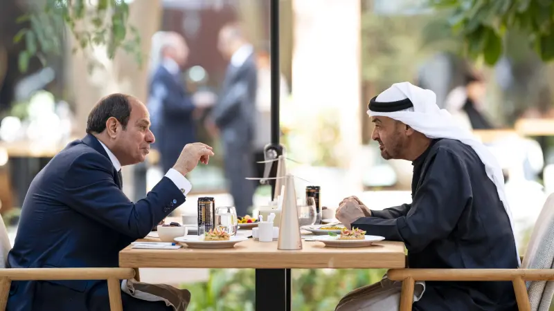 بحث رئيس دولة الإمارات العربية المتحدة الشيخ محمد بن زايد آل نهيان، مع نظيره المصري عبد الفتاح السيسي، العلاقات الأخوية ومختلف جوانب التعاون والعمل المشترك بين البلدين وفرص تعزيزهما خصوصا في المجالات التنموية والاقتصادية بما يخدم مصالحهما المشتركة.