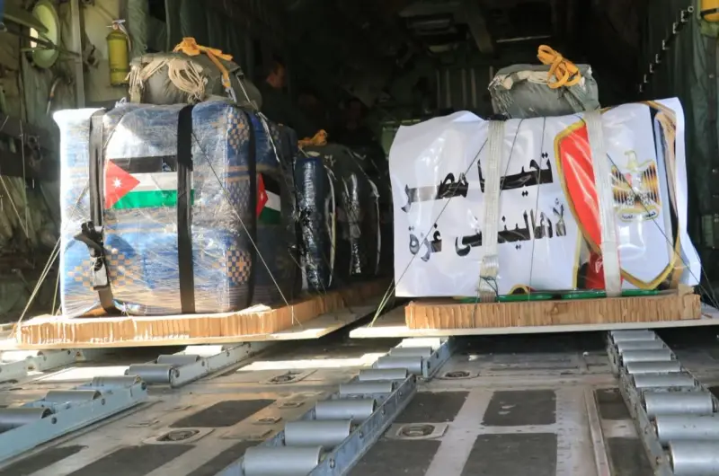 وأكدت القوات المسلحة أنها مستمرة بإرسال المساعدات عبر جسر جوي، لإيصالها سواء كانت من خلال طائرات المساعدات من مطار ماركا العسكري فغي العاصمة عمّان باتجاه مطار العريش الدولي أو من خلال عمليات الإنزال الجوي على قطاع غزة.