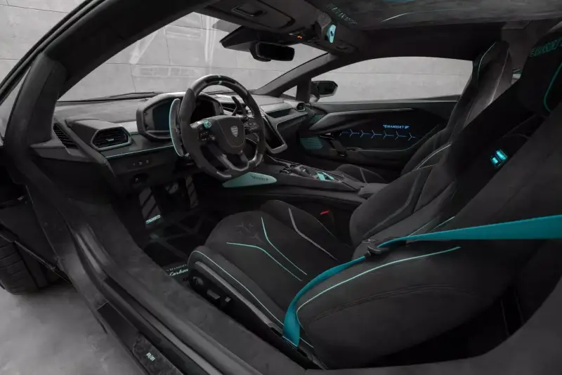 وحظيت المقصورة الداخلية باهتمام كبير، حيث تكتسي بجلد فاخر وتشطيبات من مادة ألكانتارا مع لمسات باللون الفيروزي المميز. كما تم دمج إضاءة محيطية مخصصة في بطانات الأبواب، بالإضافة إلى انتشار شعارات منصوري في مختلف أنحاء المقصورة لتعزيز الطابع الحصري للسيارة.